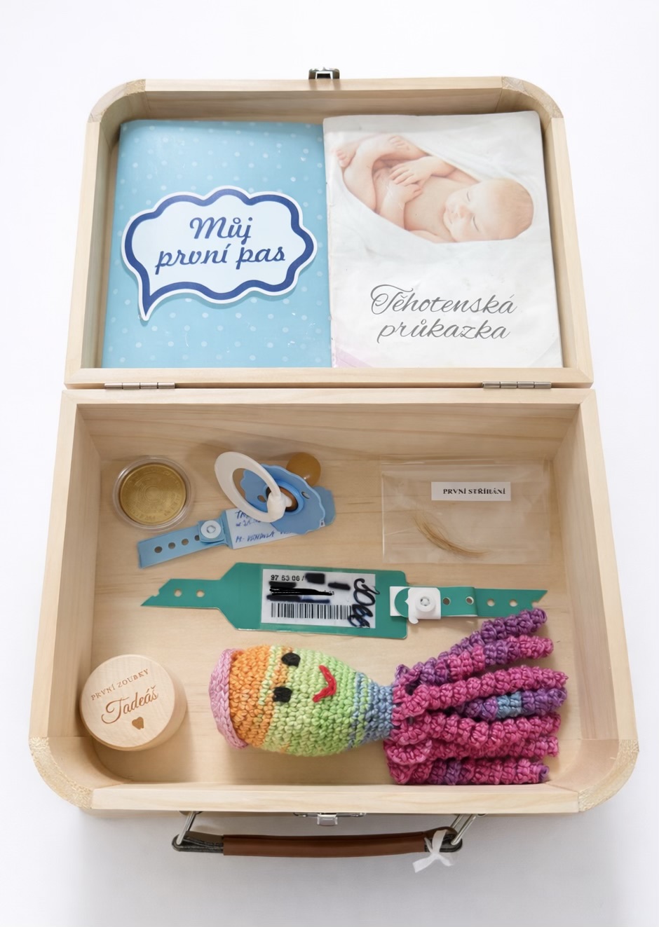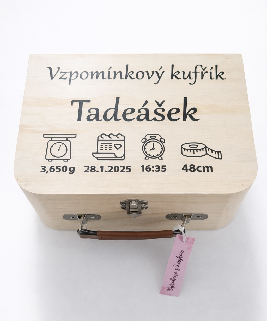 Na kufřík vám vytvoříme jakýkoliv motiv dle vašeho přání. Může sloužit jako vzpomínkový box na poklady vašeho děťátka – první zoubky, vlásky, první dudlík a další drobnosti, které si chcete uchovat navždy.